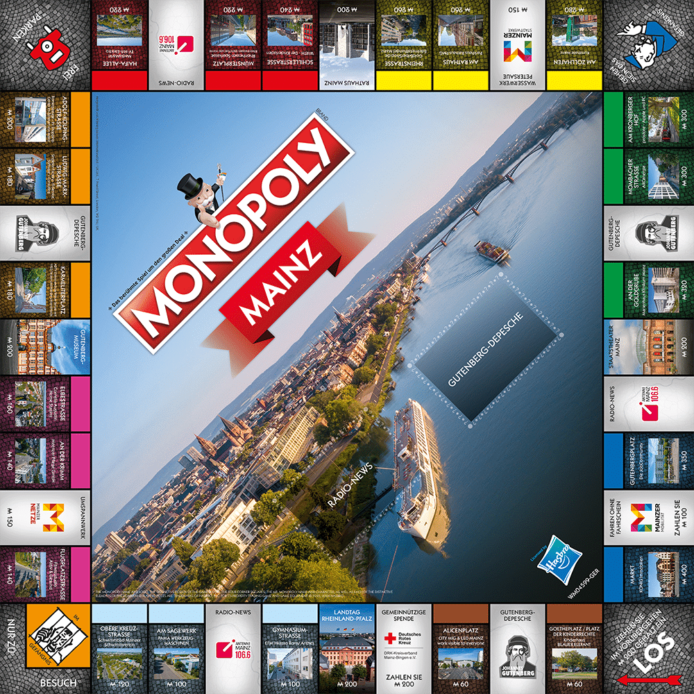 Sie müssen sich hier registrieren und eingeloggt sein, bevor Sie alle Preise sehen können und Bestellungen tätigen können.Das Kultspiel Monopoly in der Mainz-Version. Entdecke die Gutenbergstadt ganz neu und spiele dich durch die Straßen und Plätze Mainz..