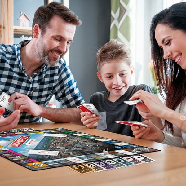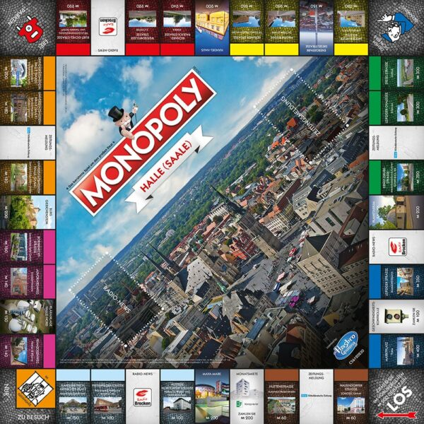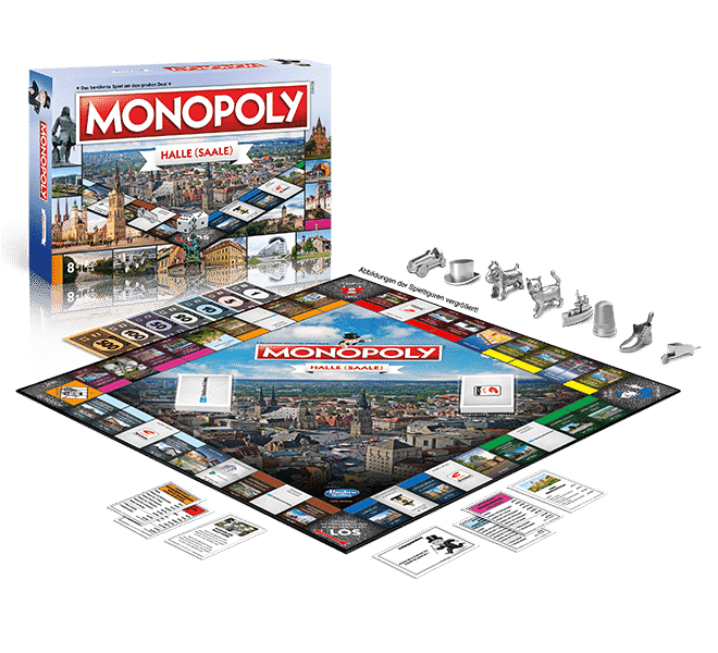 Überregional bekannte Festivals, innovative Unternehmen, ausgedehnte Wasser- und Grünflächen sowie eine vielfältige Vereinslandschaft – Halle ist ein Ort zum (er)leben, arbeiten und wohlfühlen. In der einwohnerreichsten Stadt Sachsen-Anhalts befinden sich nicht nur eine der ältesten Universitäten Deutschlands, sondern auch das Kunstmuseum Moritzburg Halle (Saale), das Händel-Geburtshaus und das Landesmuseum für Vorgeschichte mit der Himmelsscheibe von Nebra. Letztere zählt zum Weltdokumentenerbe der UNESCO – mit der MONOPOLY Stadtedition Halle findet diese Vielfalt nun auch ihren Weg auf das berühmteste Brettspiel der Welt. Auf geht’s also: Errichten Sie Hotels am Hans-Dietrich-Genscher-Platz, investieren sie in Marktplatz, Leipziger Straße oder Pfännerhöhe und steigen Sie so zum Großgrund- und Immobilienbesitzer auf, in einer Stadt, die in ihrem Inneren nicht nur zwei Burgen, sondern auch der ältesten Schokoladenfabrik Deutschlands einen Platz bietet. Aber Halle kann noch mehr: Die Stadt ist eine gute Adresse für Gründer und Unternehmer aus den Bereichen erneuerbare Energien, (Elektro-)Mobilität, (Spezial-)Maschinenbau, Sensorik, Biotechnologie sowie der Medien- und Kreativbranche. Da zahlt man doch gern seine Steuern, wenn man auf dem MONOPOLY- Ereignisfeld die passende Karte zieht. Und selbst eine kleine Zwangspause im Gefängnis kann eine gute Gelegenheit sein, über die nächste lohnenswerte Investition in Halle nachzudenken.